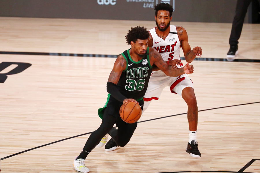 Sep 17, 2020; Lake Buena Vista, Florida, USA; Boston Celtics guard Marcus Smart (36) dribbles past Miami Heat forward Derrick Jones Jr. (5) during the fourth quarter in game two of the Eastern Conference Finals of the 2020 NBA Playoffs at ESPN Wide World of Sports Complex. The Miami Heat won 106-101. Mandatory Credit: Kim Klement-USA TODAY Sports |Courtesy Reuters