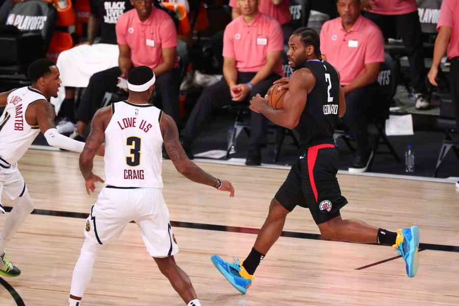 Sep 15, 2020; Lake Buena Vista, Florida, USA; Los Angeles Clippers forward Kawhi Leonard (2) handles the ball in front of Denver Nuggets guard Monte Morris (11) and forward Torrey Craig (3) during the first half in game seven of the second round of the 2020 NBA Playoffs at ESPN Wide World of Sports Complex. Mandatory Credit: Kim Klement-USA TODAY Sports | Courtesy Reuters