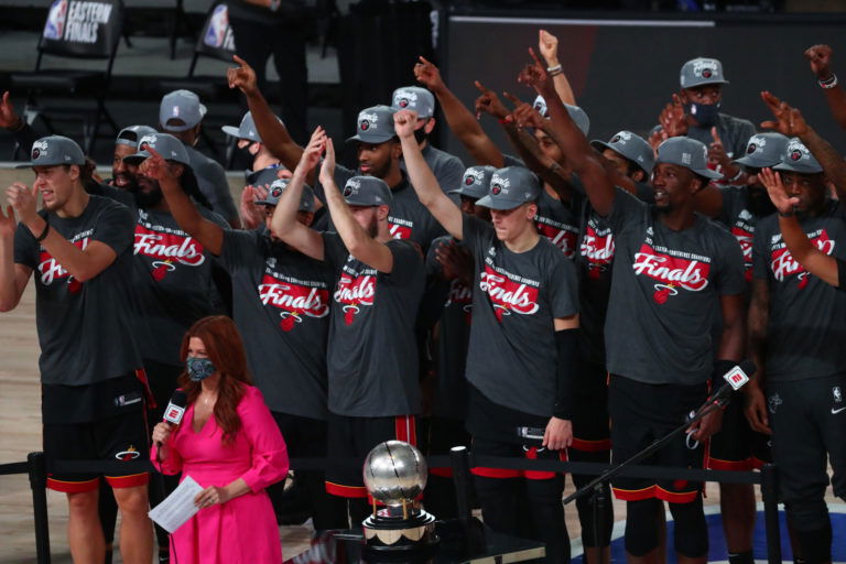 The Miami Heat applaud as they receive the Eastern Conference Championship trophy after defeating the Boston Celtics in game six of the Eastern Conference Finals of the 2020 NBA Playoffs at AdventHealth Arena. Mandatory Credit: Kim Klement-USA TODAY Sports