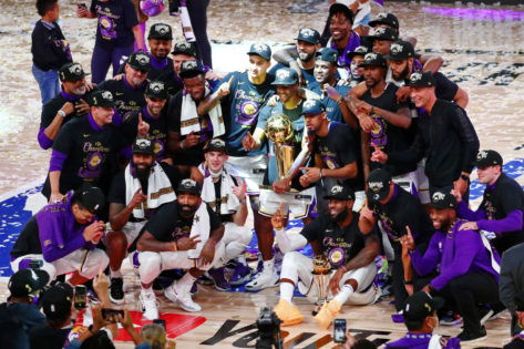 Oct 11, 2020; Lake Buena Vista, Florida, USA; The Los Angeles Lakers pose for a photo after game six of the 2020 NBA Finals at AdventHealth Arena. The Los Angeles Lakers won 106-93 to win the series. Mandatory Credit: Kim Klement-USA TODAY Sports