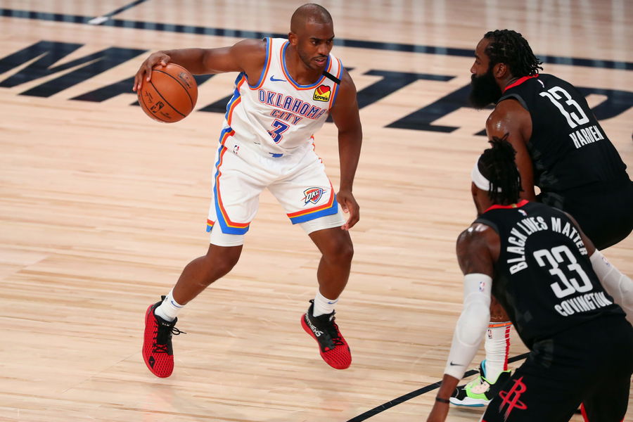 LAKE BUENA VISTA, FLORIDA – AUGUST 24: James Harden #13 of the Houston Rockets draws a foul from Chris Paul #3 of the Oklahoma City Thunder during the second quarter in Game Four of the Western Conference First Round during the 2020 NBA Playoffs at AdventHealth Arena at ESPN Wide World Of Sports Complex on August 24, 2020 in Lake Buena Vista, Florida. NOTE TO USER: User expressly acknowledges and agrees that, by downloading and or using this photograph, User is consenting to the terms and conditions of the Getty Images License Agreement. (Photo by Kevin C. Cox/Getty Images)