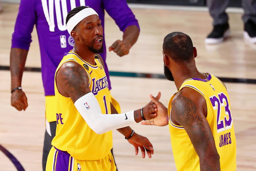 Sep 18, 2020; Lake Buena Vista, Florida, USA; Los Angeles Lakers guard Kentavious Caldwell-Pope (1) is congratulated by forward LeBron James (23) after making a three-point basket against the Denver Nuggets during the third quarter in game one of the Western Conference Finals of the 2020 NBA Playoffs at AdventHealth Arena. Mandatory Credit: Kim Klement-USA TODAY Sports