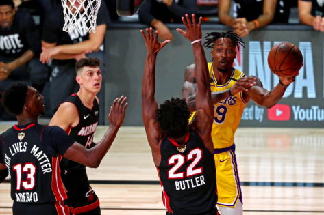 Sep 30, 2020; Orlando, Florida, USA; Los Angeles Lakers center Dwight Howard (39) passes the ball against Miami Heat forward Jimmy Butler (22) during the third quarter in game one of the 2020 NBA Finals at AdventHealth Arena. Mandatory Credit: Kim Klement-USA TODAY Sports