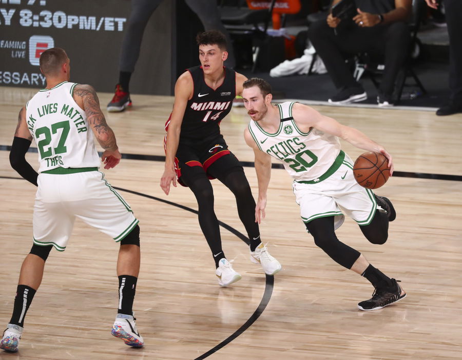 Sep 25, 2020; Lake Buena Vista, Florida, USA; Boston Celtics forward Gordon Hayward (20) controls the ball against the Miami Heat during the second half in game five of the Eastern Conference Finals of the 2020 NBA Playoffs at AdventHealth Arena. Mandatory Credit: Kim Klement-USA TODAY Sports