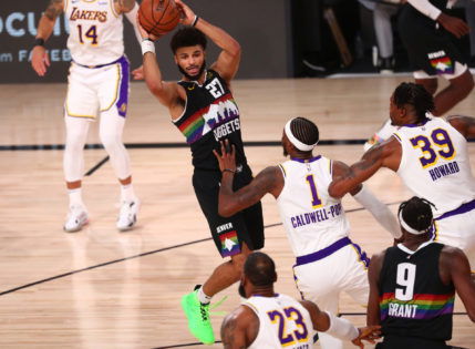 Sep 22, 2020; Lake Buena Vista, Florida, USA; Denver Nuggets guard Jamal Murray (27) passes the ball to forward Jerami Grant (9) against Los Angeles Lakers forward LeBron James (23) and guard Kentavious Caldwell-Pope (1) and center Dwight Howard (39) during the second half of game three of the Western Conference Finals of the 2020 NBA Playoffs at AdventHealth Arena. Mandatory Credit: Kim Klement-USA TODAY Sports