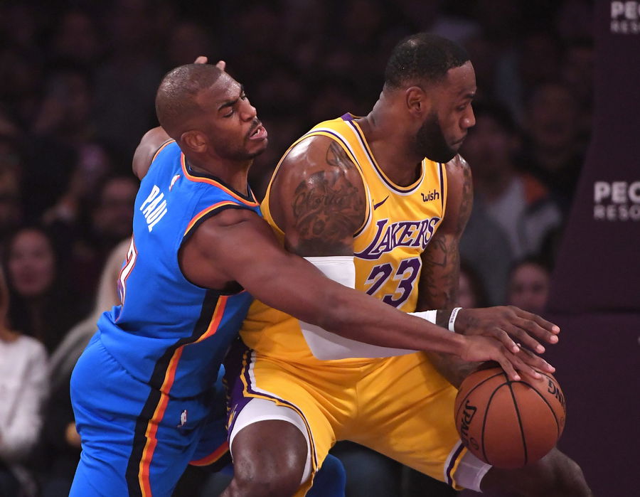 Nov 19, 2019; Los Angeles, CA, USA; Oklahoma City Thunder guard Chris Paul (3) steals the ball from Los Angeles Lakers forward LeBron James (23) in the first half of the game at Staples Center. Mandatory Credit: Jayne Kamin-Oncea-USA TODAY Sports