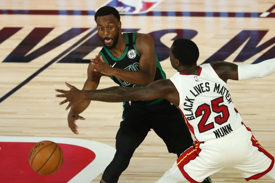Sep 15, 2020; Lake Buena Vista, Florida, USA; Boston Celtics guard Kemba Walker (8) passes the ball while Miami Heat guard Kendrick Nunn (25) defends during the second half in game one of the Eastern Conference Finals of the 2020 NBA Playoffs at ESPN Wide World of Sports Complex. Mandatory Credit: Kim Klement-USA TODAY Sports | Courtesy Reuters