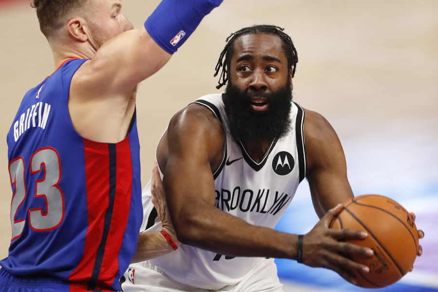 Feb 9, 2021; Detroit, Michigan, USA; Brooklyn Nets guard James Harden (R) goes up for a shot against Detroit Pistons forward Blake Griffin (23) during the first quarter at Little Caesars Arena. Mandatory Credit: Raj Mehta-USA TODAY Sports