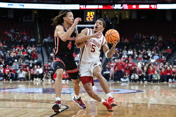 December 20, 2025, Newark, New Jersey, USA: Arkansas Razorbacks guard Darius Acuff Jr. 5 drives to the basket while Houston Cougars guard Kingston Flemings 4 plays defense in the first half of the Never Forget Tribute Classic at Prudential Center. Newark USA – ZUMAs325 20251220_zsp_s325_012 Copyright: xJessxStilesx