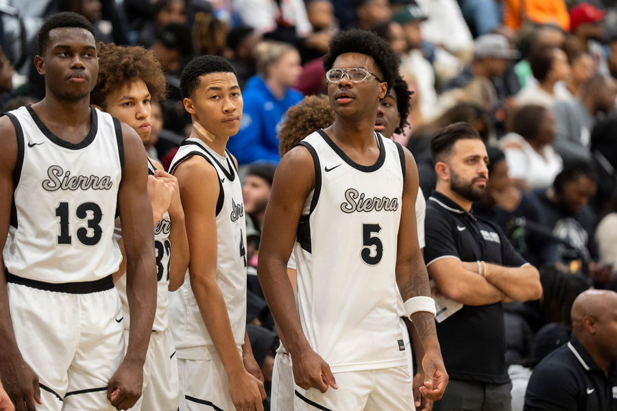 Sierra Canyon’s Bryce James (5), the son of NBA player LeBron James, stands with his teammates by the bench before the game between Sierra Canyon and Bartlett High School during Memphis Hoopfest in Eads, Tenn., on Friday, January 3, 2025.