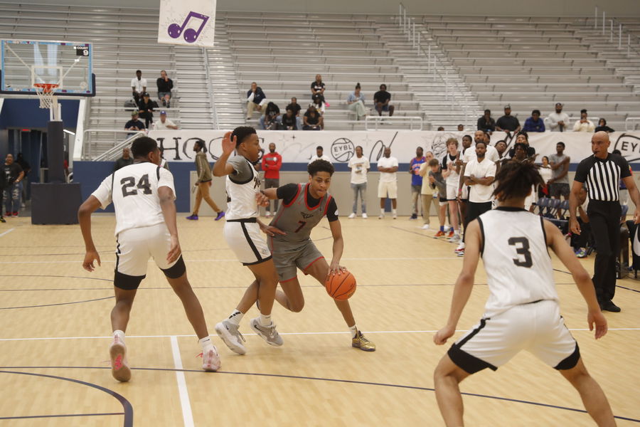 Team Melo’s Kiyan Anthony (7) looks to penetrate the defense of Team Mokan Elite during the Nike EYBL Session 4 on May 27, 2023 at Memphis Sports and Events Center in Memphis, Tenn.