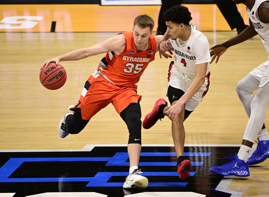 Mar 19, 2021; Indianapolis, Indiana, USA; Syracuse Orange guard Buddy Boeheim (35) dribbles against San Diego State Aztecs guard Trey Pulliam (4) during the first round of the 2021 NCAA Tournament at Hinkle Fieldhouse. Mandatory Credit: Marc Lebryk-USA TODAY Sports