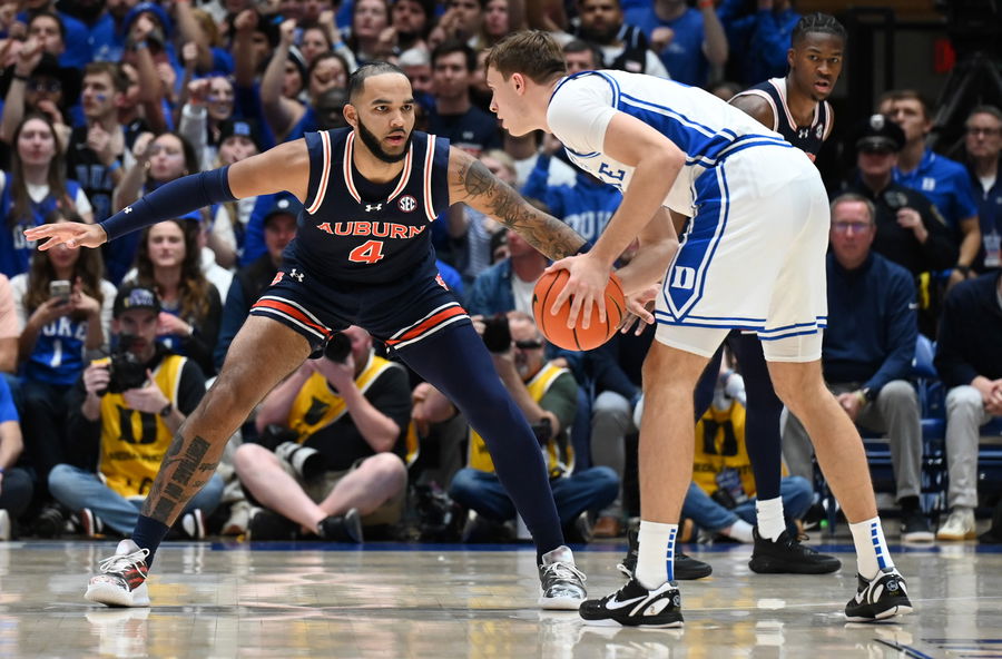 Dec 4, 2024; Durham, North Carolina, USA; Duke Blue Devils forward Cooper Flagg (2) controls the ball in front of Auburn Tigers center Johni Broome (4) during the first half at Cameron Indoor Stadium. Mandatory Credit: Rob Kinnan-Imagn Images