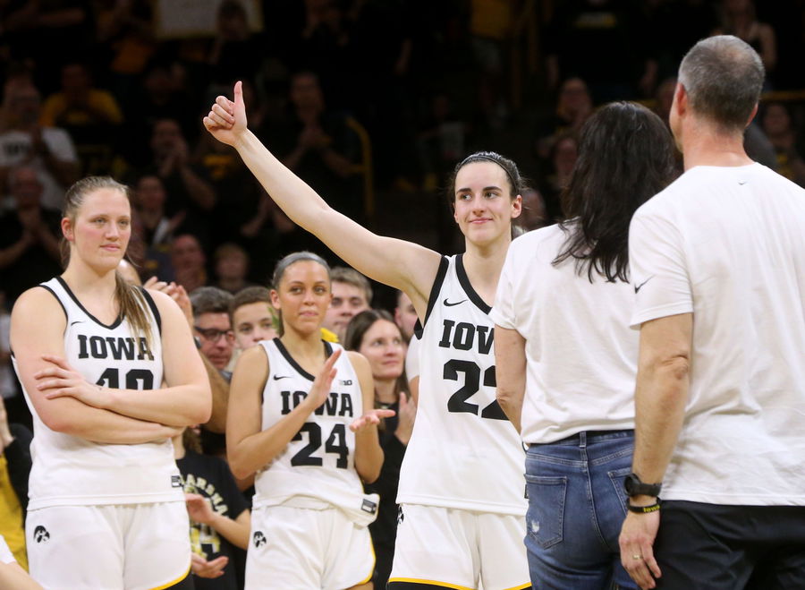 Iowa’s Caitlin Clark (22) gives a thumbs-up to the crowd during senior recognition after playing Ohio State Sunday, March 3, 2024 at Carver-Hawkeye Arena in Iowa City, Iowa.