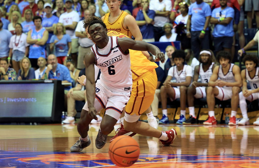 Nov 26, 2024; Lahaina, Hawaii, USA; Dayton Flyers guard Enoch Cheeks (6) chases a loose ball against the Iowa State Cyclones in the second half at Lahaina Civic Center. Mandatory Credit: Marco Garcia-Imagn Images
