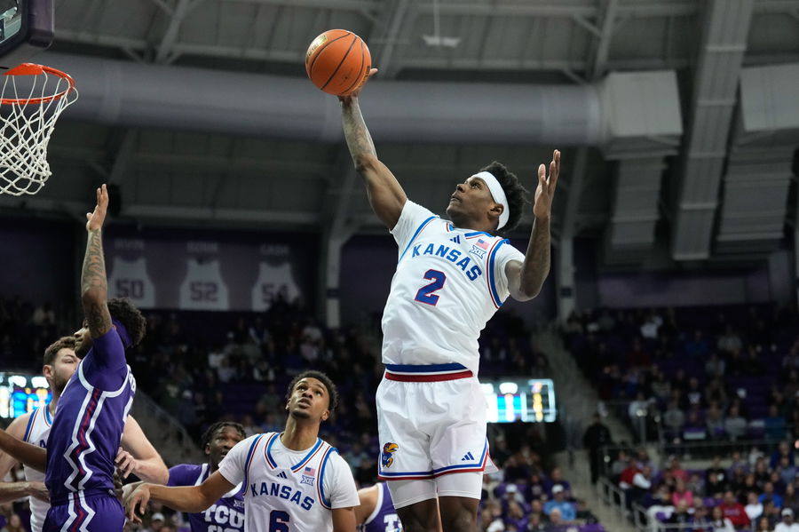 Jan 22, 2025; Fort Worth, Texas, USA; Kansas Jayhawks guard AJ Storr (2) grabs a rebound against the TCU Horned Frogs during the first half at Ed and Rae Schollmaier Arena. Mandatory Credit: Chris Jones-Imagn Images