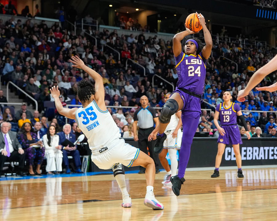 Mar 30, 2024; Albany, NY, USA; LSU Tigers guard Aneesah Morrow (24) shoot a jump shot against UCLA Bruins guard Camryn Brown (35) during the second half in the semifinals of the Albany Regional of the 2024 NCAA Tournament at MVP Arena. Mandatory Credit: Gregory Fisher-USA TODAY Sports