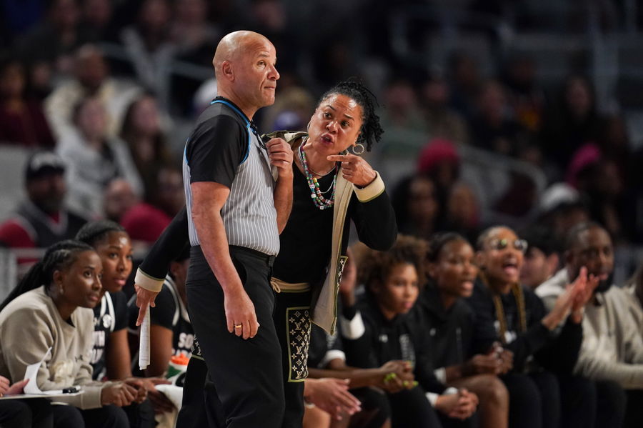 Dec 8, 2024; Fort Worth, Texas, USA; South Carolina Gamecocks head coach Dawn Staley discusses a call with an official during the first half at Dickies Arena. Mandatory Credit: Chris Jones-Imagn Images