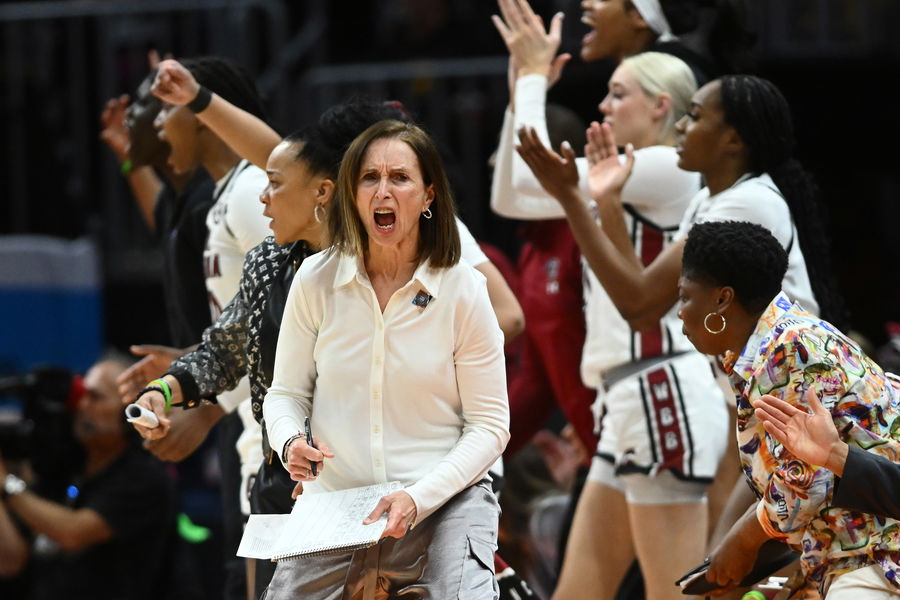 Apr 5, 2024; Cleveland, OH, USA; South Carolina Gamecocks assistant coach Lisa Boyer reacts against the NC State Wolfpack in the semifinals of the Final Four of the womens 2024 NCAA Tournament at Rocket Mortgage FieldHouse. Mandatory Credit: Ken Blaze-Imagn Images
