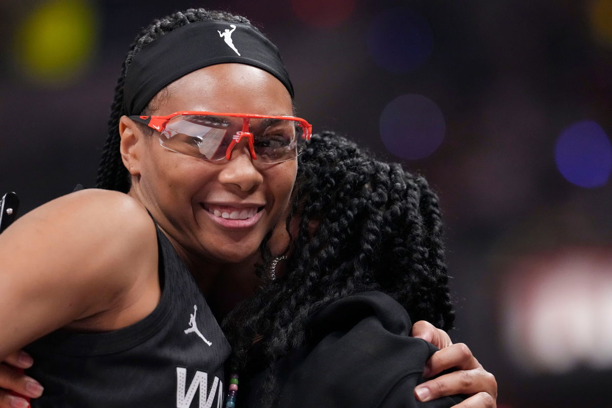 Atlanta Dream’s Allisha Gray (15) hugs South Carolina women’s basketball head coach Dawn Staley on Saturday, July 19, 2025, during the WNBA All-Star Game at Gainbridge Fieldhouse in Indianapolis.