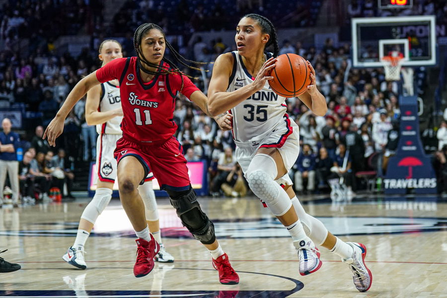 Feb 12, 2025; Storrs, Connecticut, USA; UConn Huskies guard Azzi Fudd (35) drives the ball against St. John’s Red Storm forward Janeya Grant (11) in the second half at Harry A. Gampel Pavilion. Mandatory Credit: David Butler II-Imagn Images