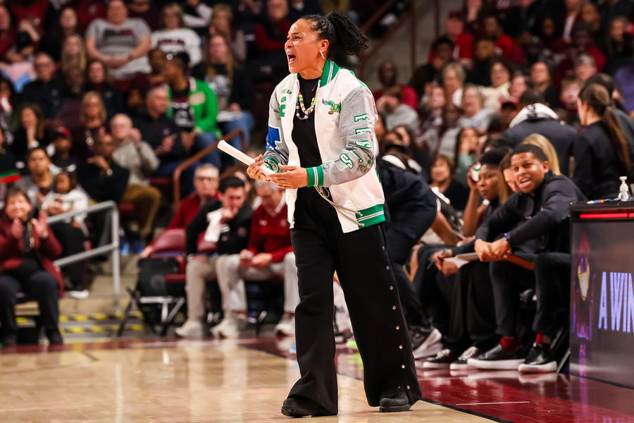 Jan 12, 2025; Columbia, South Carolina, USA; South Carolina Gamecocks head coach Dawn Staley directs her team against the Texas Longhorns in the first half at Colonial Life Arena. Mandatory Credit: Jeff Blake-Imagn Images