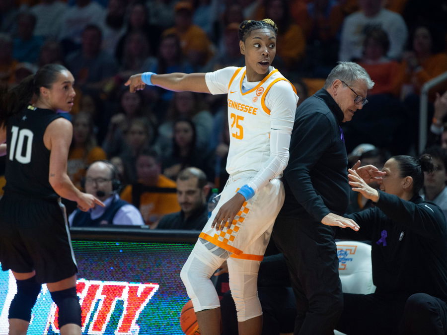 Tennessee’s Jordan Horston (25) bumps into UConn basketball coach Geno Auriemma after a play while indicating that Nika Mühl (10) put the ball out of bounds during the NCAA college basketball game between the Tennessee Lady Vols and Connecticut Huskies in Knoxville, Tenn. on Thursday, January 26, 2023.