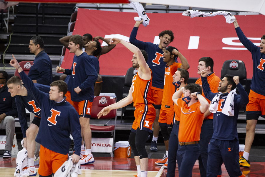 Mar 6, 2021; Columbus, Ohio, USA; The Illinois Fighting Illini bench celebrates after a three-point basket against the Ohio State Buckeyes at Value City Arena. Mandatory Credit: Greg Bartram-USA TODAY Sports