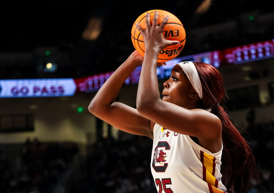 Dec 29, 2024; Columbia, South Carolina, USA; South Carolina Gamecocks guard Raven Johnson (25) attempts a three point basket against the Wofford Terriers in the second half at Colonial Life Arena. Mandatory Credit: Jeff Blake-Imagn Images
