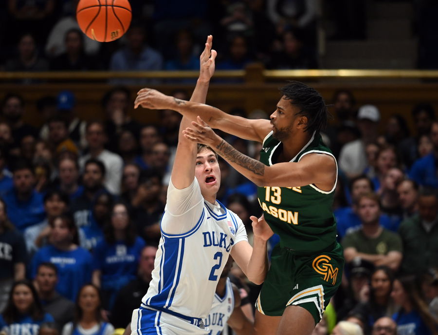 Dec 17, 2024; Durham, North Carolina, USA; George Mason Patriots guard Darius Maddox (13) throws a pass over Duke Blue Devils forward Cooper Flagg (2) during the first half at Cameron Indoor Stadium. Mandatory Credit: Rob Kinnan-Imagn Images