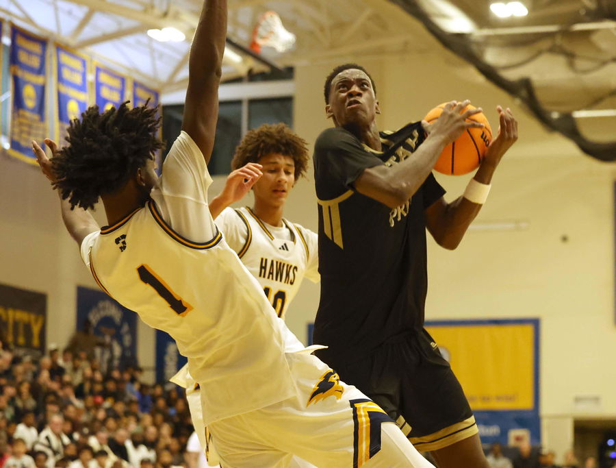 Utah Prep’s AJ Dybantsa drives to the basket on Highland’s Josh Hamilton and Nate Ament during a game at Emmanuel College in Boston on Tuesday, Nov. 5, 2024.
