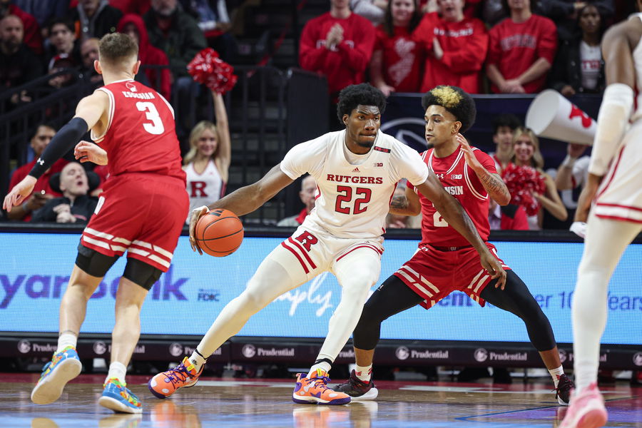 Feb 10, 2024; Piscataway, New Jersey, USA; Rutgers Scarlet Knights center Emmanuel Ogbole (22) dribbles the ball against Wisconsin Badgers guard AJ Storr (2) during the first half at Jersey Mike’s Arena. Mandatory Credit: Vincent Carchietta-USA TODAY Sports