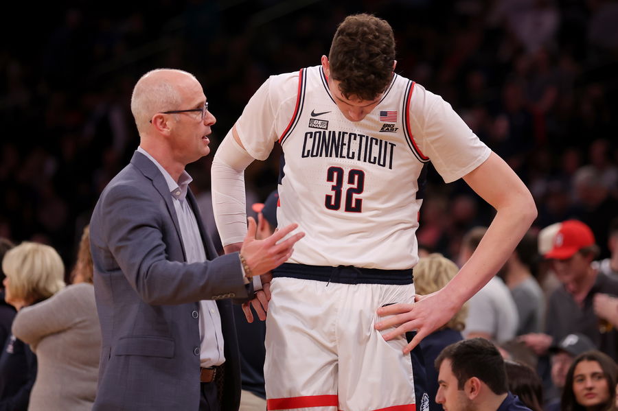 Mar 15, 2024; New York City, NY, USA; Connecticut Huskies head coach Dan Hurley talks to center Donovan Clingan (32) during the second half against the St. John’s Red Storm at Madison Square Garden. Mandatory Credit: Brad Penner-USA TODAY Sports