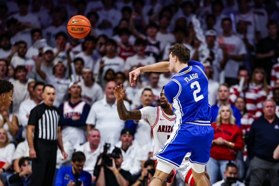 Nov 22, 2024; Tucson, Arizona, USA; Duke Blue Devils forward Cooper Flagg (2) passes the ball during the second half against the Arizona Wildcats at McKale Center. Mandatory Credit: Aryanna Frank-Imagn Images