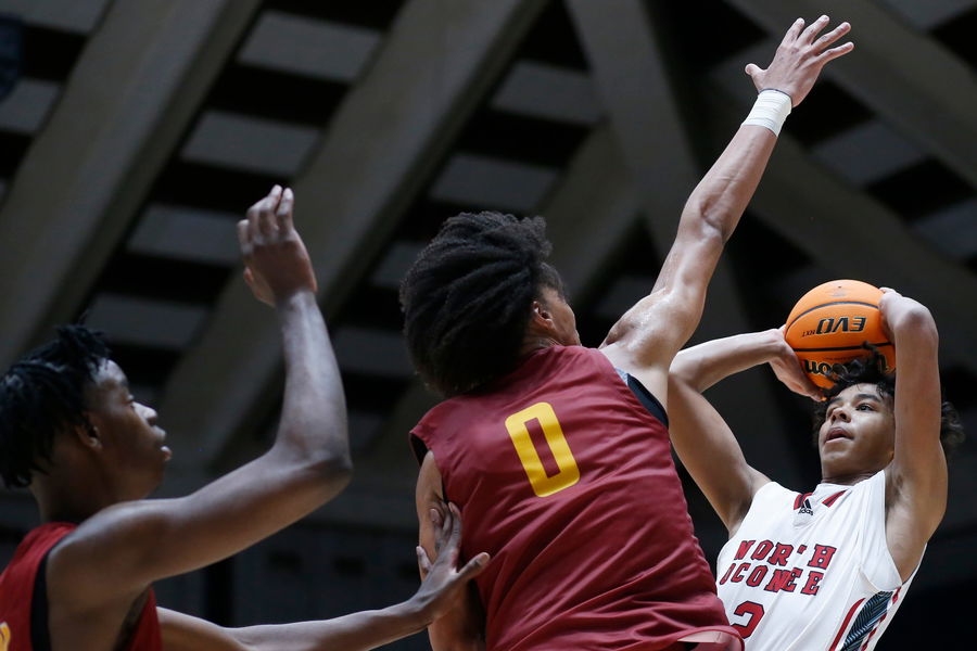 North Oconee’s Justin Wise (2) takes a shot while being defended by Holy Innocents Episcopal’s Will Hopkins (0) and Holy Innocents Episcopal’s Caleb Wilson (24) during the GHSA high school basketball AAAA Region 8 championship game in Macon, Ga., on Wednesday, March 6, 2024. North Oconee won 65-60.