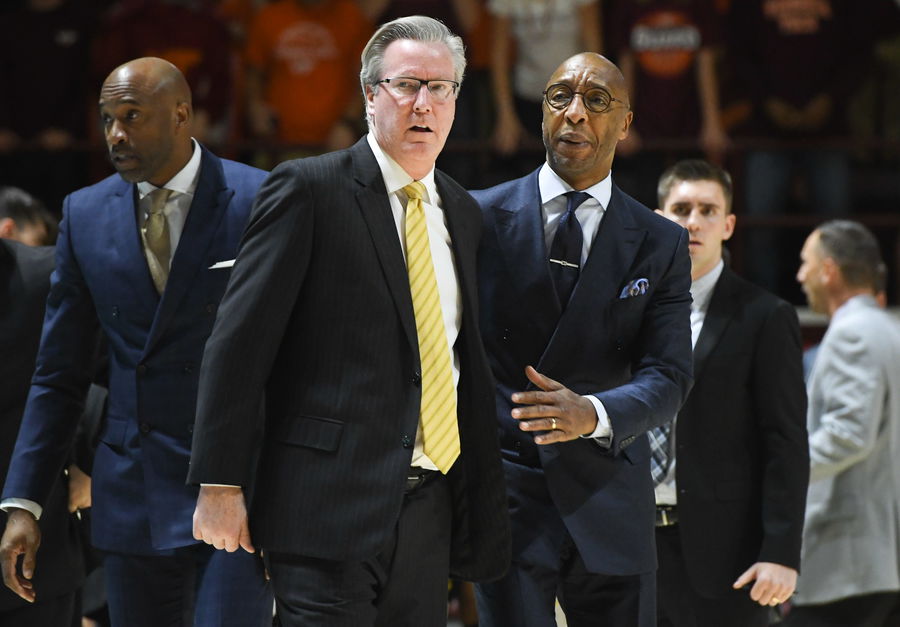 Nov 28, 2017; Blacksburg, VA, USA; Iowa Hawkeyes head coach Frank McCaffery reacts following a technical foul called on his team in the first half against the Virginia Tech Hokies at Cassell Coliseum. Mandatory Credit: Michael Shroyer-USA TODAY Sports
