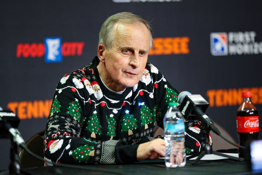 Dec 23, 2024; Knoxville, Tennessee, USA; Tennessee Volunteers head coach Rick Barnes speaks during the post game interview after the game against the Middle Tennessee Blue Raiders at Thompson-Boling Arena at Food City Center. Mandatory Credit: Randy Sartin-Imagn Images