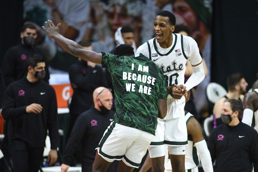 Feb 9, 2021; East Lansing, Michigan, USA; Michigan State Spartans forward Marcus Bingham Jr. (30) celebrates after defeating the Penn State Nittany Lions at Jack Breslin Student Events Center. Mandatory Credit: Tim Fuller-USA TODAY Sports