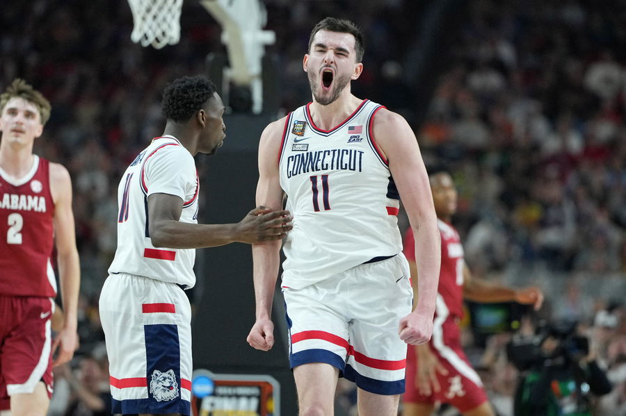 Apr 6, 2024; Glendale, AZ, USA; Connecticut Huskies forward Alex Karaban (11) celebrates after a play against the Alabama Crimson Tide with guard Hassan Diarra (10) during the second half in the semifinals of the men’s Final Four of the 2024 NCAA Tournament at State Farm Stadium. Mandatory Credit: Bob Donnan-USA TODAY Sports