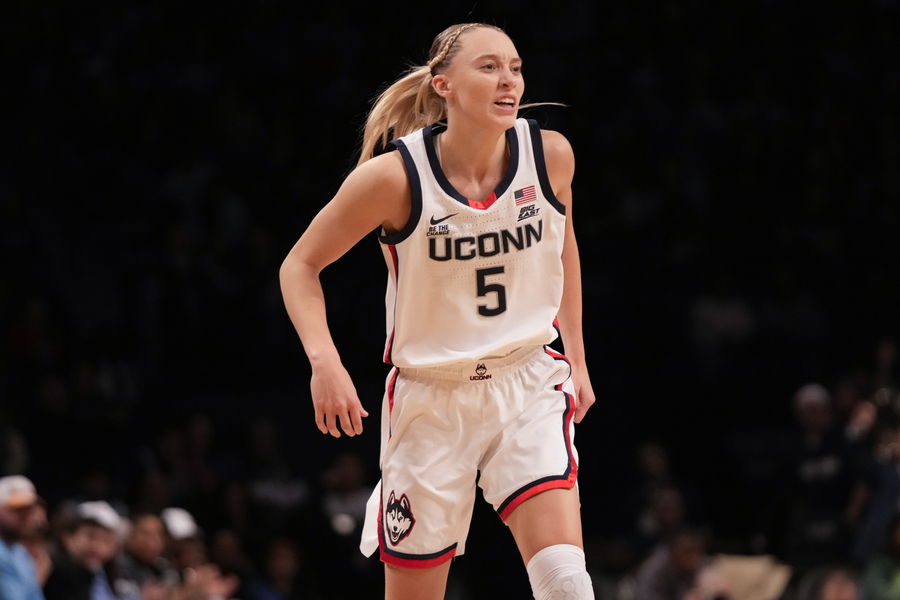 Dec 7, 2024; Brooklyn, New York, USA; Connecticut Huskies guard Paige Bueckers (5) reacts after missing a shot during the first half against the Louisville Cardinals at Barclays Center. Mandatory Credit: Lucas Boland-Imagn Images