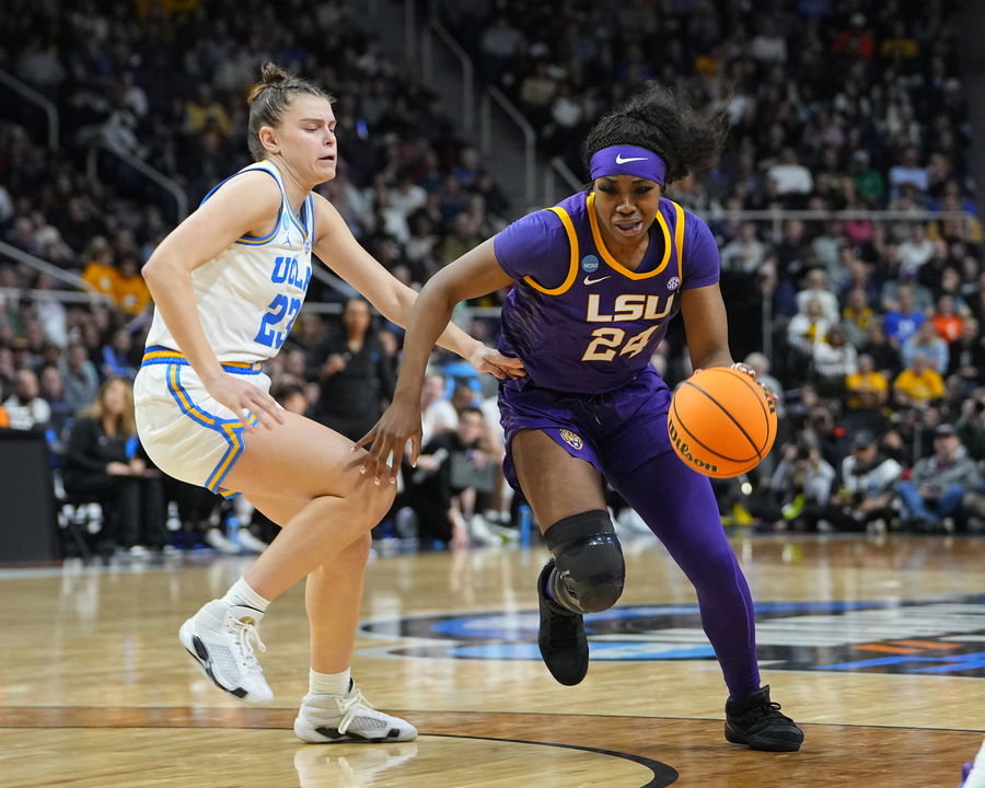 Mar 30, 2024; Albany, NY, USA; LSU Tigers guard Aneesah Morrow (24) dribbles the ball against UCLA Bruins forward Gabriela Jaquez (23) during the second half in the semifinals of the Albany Regional of the 2024 NCAA Tournament at MVP Arena. Mandatory Credit: Gregory Fisher-USA TODAY Sports