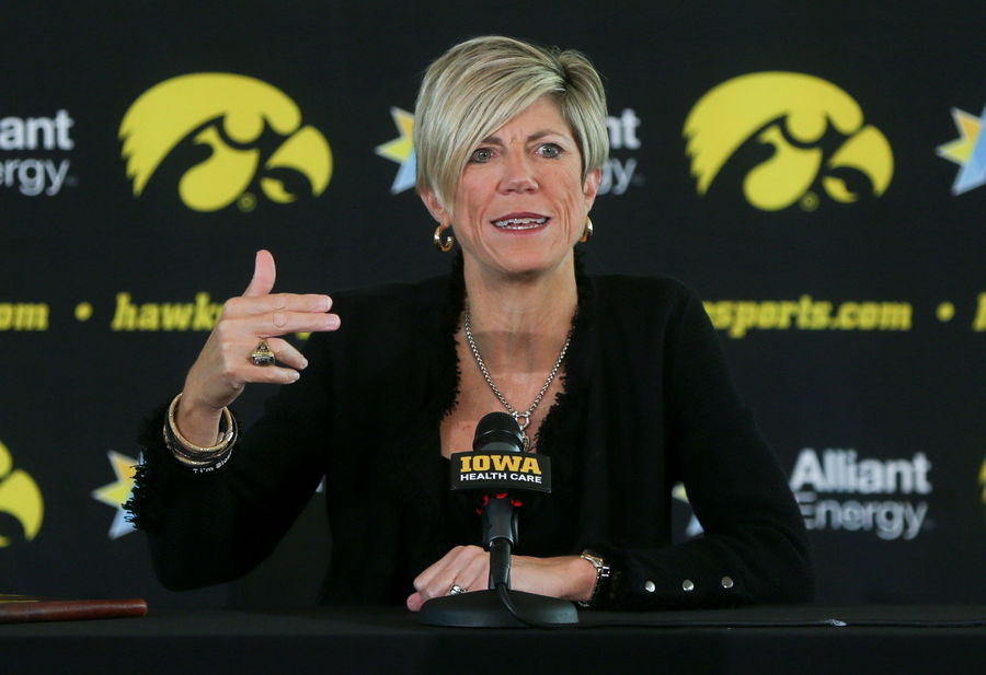 Iowa women’s basketball head coach Jan Jensen speaks with reporters during the team’s media day Thursday, Oct. 10, 2024 at Carver-Hawkeye Arena Iowa City, Iowa.