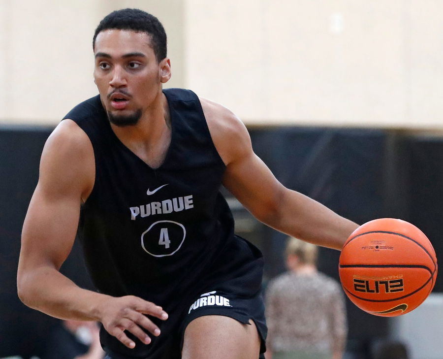 Purdue Boilermakers forward Trey Kaufman-Renn (4) drives to the basket during practice, Tuesday, June 11, 2024, at Purdue University’s Cardinal Court in West Lafayette, Ind.