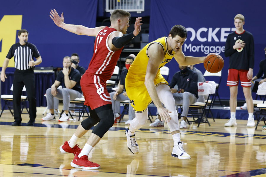 Jan 12, 2021; Ann Arbor, Michigan, USA; Michigan Wolverines center Hunter Dickinson (right) dribbles against Wisconsin Badgers forward Micah Potter. (11) in the first half at Crisler Center. Mandatory Credit: Rick Osentoski-USA TODAY Sports