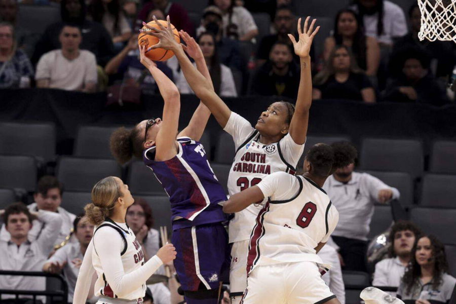 March 30, 2026: South Carolina s Maryam Dauda 30 blocks a shot by TCU s Olivia Miles 5 during the first half of their Elite Eight women s basketball game at Golden 1 Arena on Monday, March 30, 2026, in Sacramento, Calif. – ZUMAm67_ 20260330_zaf_m67_016 Copyright: xTracyxGlantzx