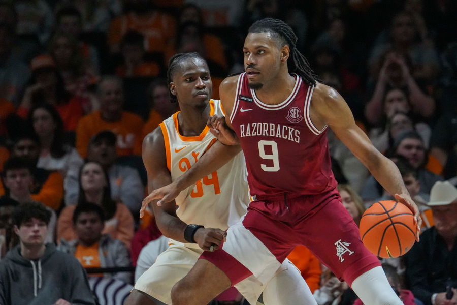 Arkansas forward Jonas Aidoo (9) dribbles around Tennessee forward Felix Okpara (34) during a college basketball game between Tennessee and Arkansas held at Thompson-Boling Arena at Food City Center in Knoxville, Tenn., on Saturday, January 4, 2025. Tennessee won 76-52 against Arkansas.