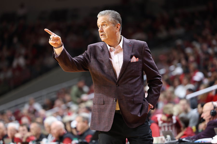 Dec 14, 2024; North Little Rock, Arkansas, USA; Arkansas Razorbacks head coach John Calipari reacts during the first half against the UCA Bears at Simmons Bank Arena. Mandatory Credit: Nelson Chenault-Imagn Images