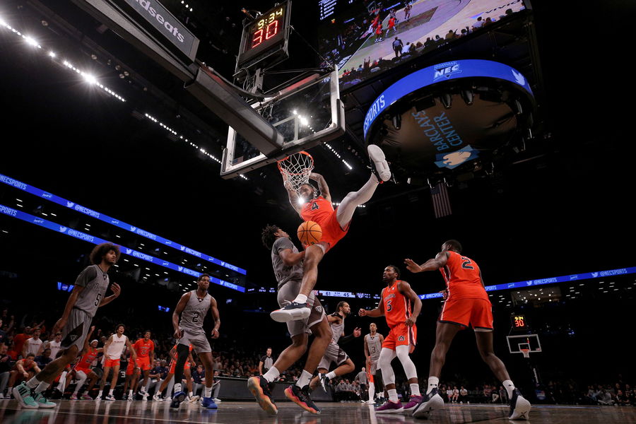 Nov 17, 2023; Brookyln, NY, USA; Auburn Tigers forward Johni Broome (4) dunks against St. Bonaventure Bonnies forward Chad Venning (32) during the second half at Barclays Center. Mandatory Credit: Brad Penner-USA TODAY Sports