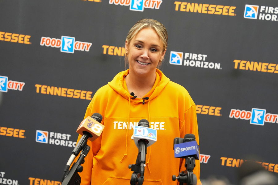 Tennessee Lady Vols basketball coach Kim Caldwell in her first news conference on Sunday, Jan. 26, 2025, in Knoxville, Tenn., after the birth of her son.