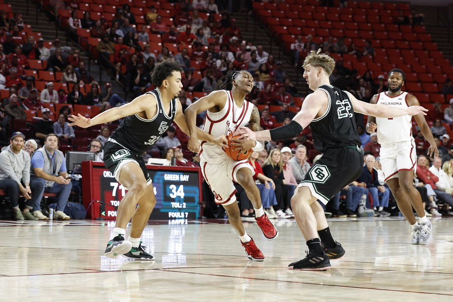 Dec 16, 2023; Norman, Oklahoma, USA; Oklahoma Sooners guard Javian McCollum (2) drives between Green Bay Phoenix guard Ryan Wade (32) and center Jacob Antchak (22) during the second half at Lloyd Noble Center. Mandatory Credit: Alonzo Adams-USA TODAY Sports